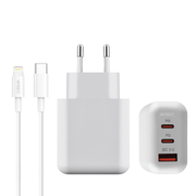 Ontketen de volle snelheid van opladen met de 45W snellader 3 poorts, uitgerust met de nieuwste GaN-technologie. Deze geavanceerde oplader levert krachtige prestaties met minimale warmteontwikkeling en is ideaal voor het tegelijk opladen van meerdere apparaten. Dankzij de drie aansluitingen (1× USB A + 2× USB C) laad je moeiteloos je iPhone, iPad of AirPods tegelijk op. De meegeleverde 1 meter USB-C naar Lightning kabel zorgt voor razendsnelle en stabiele energieoverdracht. Compact, lichtgewicht en ontworpen voor maximale efficiëntie – perfect voor thuis, kantoor of onderweg.