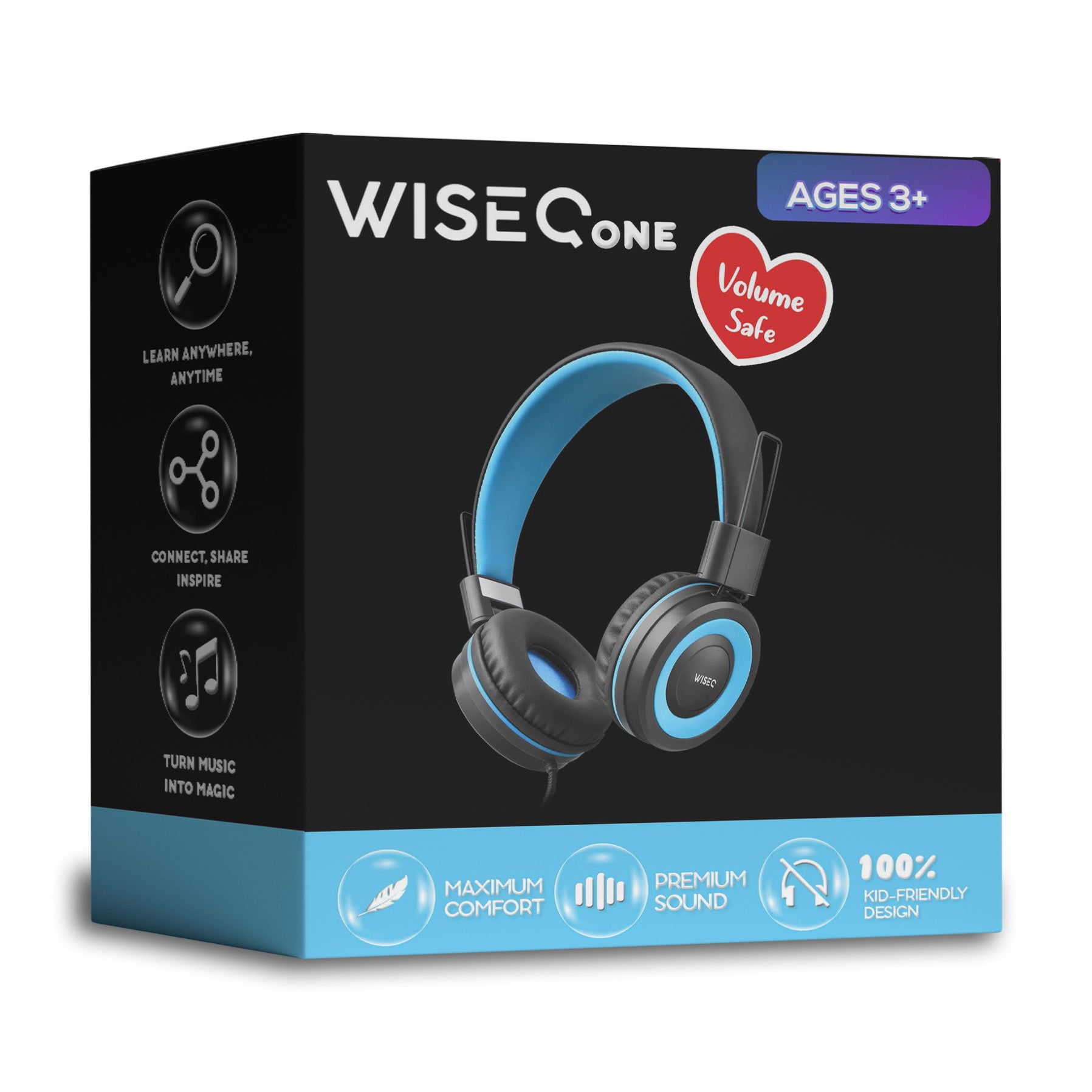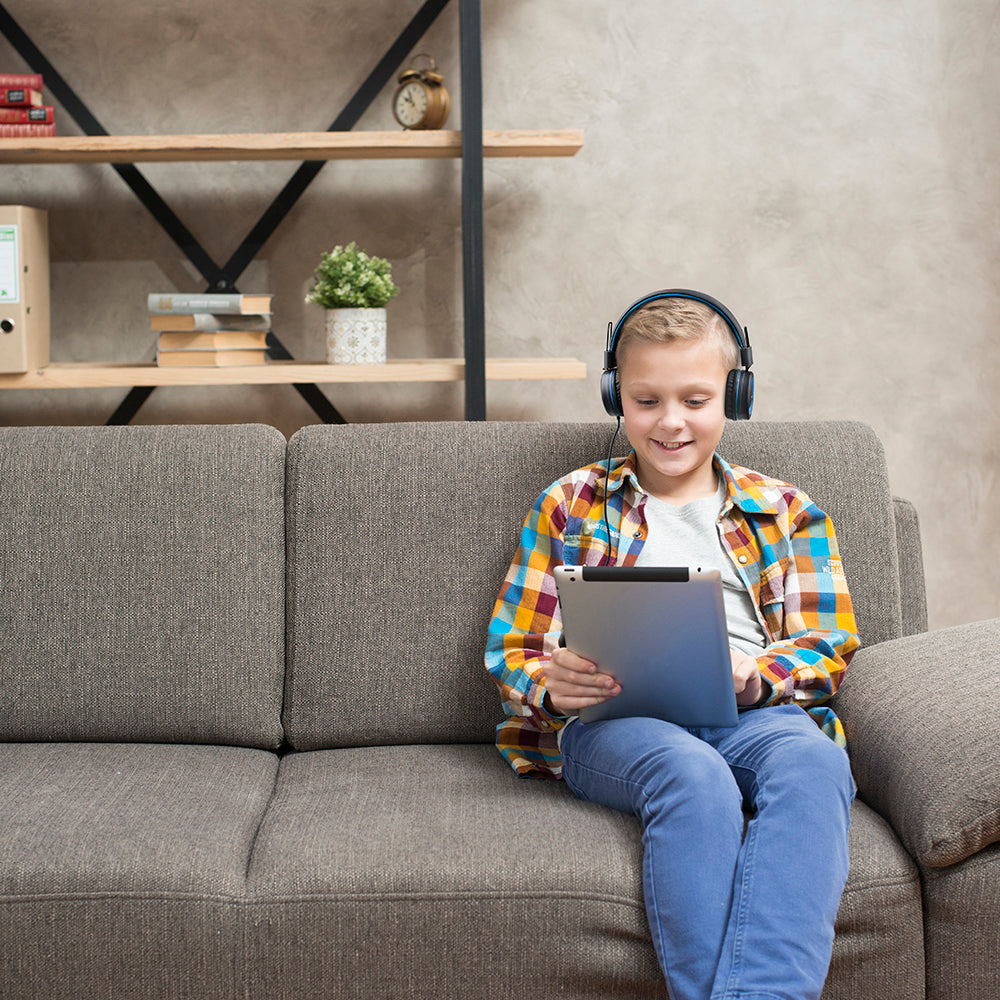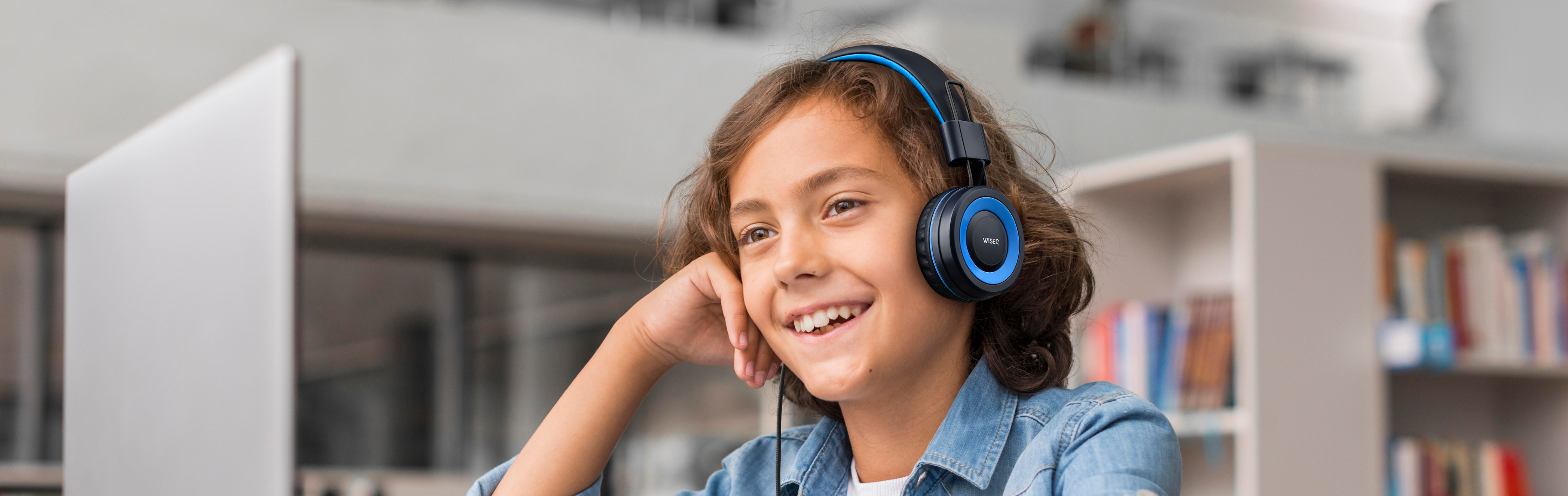 Our WiseQ One is an unparalleled, noise-cancelling wired headphone for kids with a volume limiter and microphone. Designed specifically for children of all ages, these kids' headphones offer a fantastic sound experience and comfort. Their convenient portability makes them suitable for use anywhere, whether at home, in the classroom, or on a road trip.